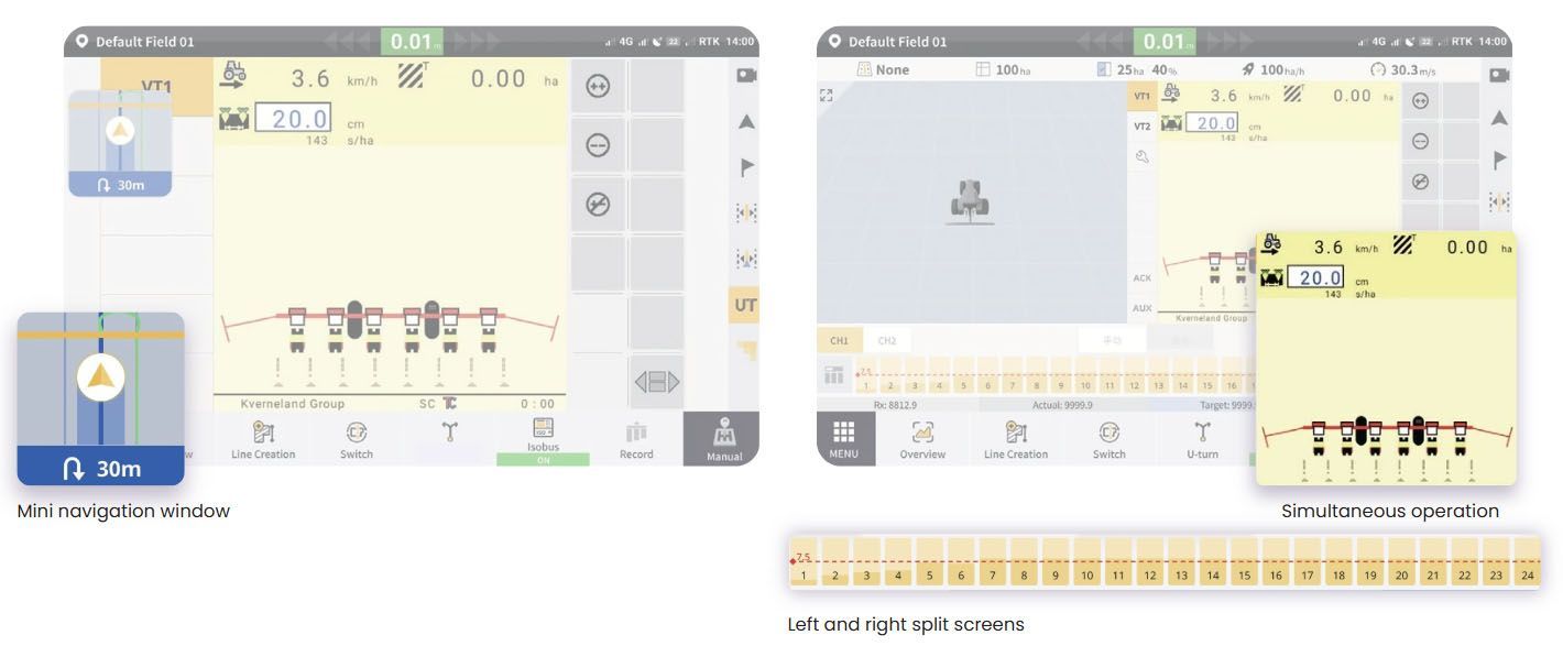 The AT2 Max stretchesthe screen size to 12.1 inches, a 46% increase in visible area compared to the standard AT2. With a larger screen, you can see everything more clearly on the display and reduce operation errors while driving your tractor at high speeds to carry out tasks. You can also work on multiple tasks at the same time through a split-screen view without constantly switching between windows.